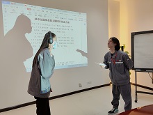 活動(dòng)中,兩兩分為一組,一人陳述總書記在二十大開幕式上的重要講話和共青團(tuán)建團(tuán)100周年大會(huì)上的重要講話中的金句,另外一個(gè)人戴著耳機(jī)看著對(duì)面那個(gè)人的口型去描述,現(xiàn)場(chǎng)氣氛歡快熱烈。